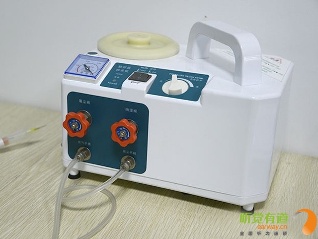 6、真空。通過以上幾步驟后,再看一看,喇叭內及導聲管內的污垢是不是清潔干凈了,如果不干凈則再次進行掏或吹洗,之后再聽一聽聲音有無改善。在整個清潔過程中,一定要邊看、邊聽、邊掏、邊吹、邊吸。有一定改善了,基本正常了,再用真空泵的真空罐吸干凈喇叭內的剩余微小耳垢及潮氣。此時再看一看、聽一聽,如果聲音正常就可以了。