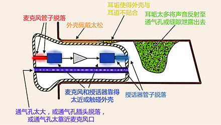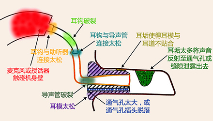 圖1里是一個定制式助聽器佩戴于外耳道內的示意圖,各種顏色的字和相應顏色的標記展示了發生嘯叫的各種情況。