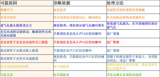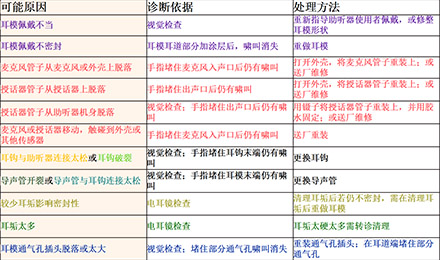 表1:ITE/ITC/CIC助聽器產生嘯叫的可能原因及對應的診斷依據、處理方法