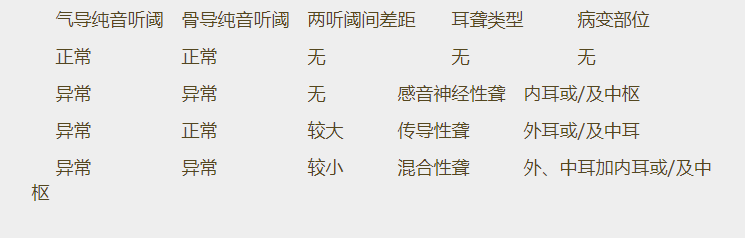 純音聽力檢查結果體現為純音聽力圖。</p><p> 正常情況下我們是通過兩條途徑來感受聲音信號的——氣導途徑和骨導途徑。前者我們非常熟悉,從外耳到中耳到內耳到聽中樞;后者我們或許不太注意:從顱骨直接到內耳到聽中樞。相應地,純音聽力檢查也有兩種聲音剌激方式,氣導輸入和骨導輸入。前者我們天天使用,而后者則很少被我們使用。事實上,兩閾值曲線的異同正是我們判斷聽損病變部位的基礎(見下表)。了解患者病變部位對于獲得他們的信任以及確定助聽器電聲性能都有非同尋常的意義。因此,有條件的時候還是應當重視骨導聽閾測試。</p><p style="text-align: center;"><img src="/upfiles/201906100237368907.png" alt="" /><br /></p><p> 更多詳情請登錄聽覺有道助聽器www.zjqianhao.com</p>" />