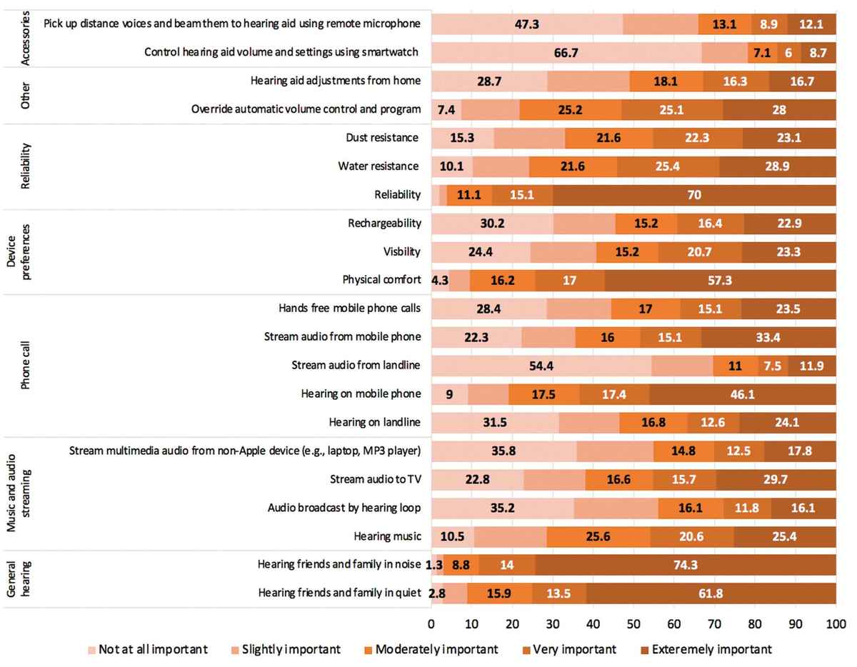 助聽器用戶們最關注的是在噪聲環境下的清晰度,其次是設備可靠性、安靜環境下的清晰度和佩戴舒適度。