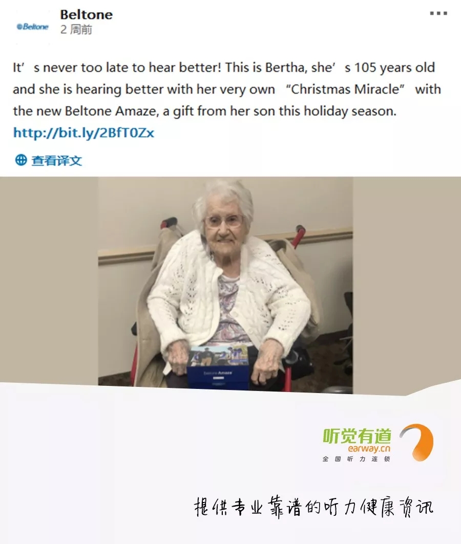 在美國,有一位叫做Bertha的老奶奶,去年她就已經105歲了。去年圣誕,她的兒子帶她配了一臺美國貝爾通助聽器,作為圣誕禮物。