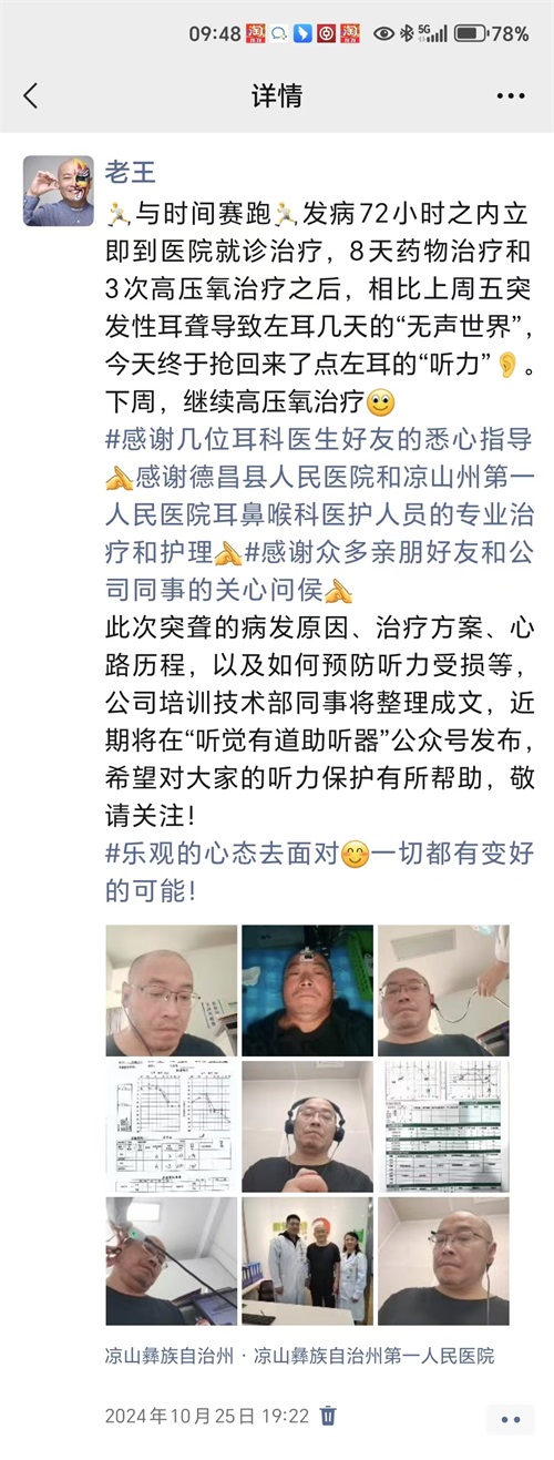 在這個(gè)快節(jié)奏的世界里,每一個(gè)細(xì)微的聲音都承載著生活的溫度。然而,突如其來的聽力挑戰(zhàn),卻讓這份美好變得模糊。<br /><br /><br />聽覺有道全國聽力連鎖聯(lián)合創(chuàng)始人王曉剛先生,期間或因工作過度操勞,于2024年10月16日的夜晚,耳道內(nèi)突然響起了一聲“砰”的異響。次日,他的耳內(nèi)又相繼出現(xiàn)了“噗噗”聲、“滋滋”聲的雜音,與人交談時(shí),聽不清、甚至聽不到對方的話語變得愈發(fā)顯著。<br /><br /></span><p><span style="font-size:16px;">以下任何一項(xiàng)癥狀單獨(dú)或突發(fā)性耳聾的發(fā)病原因及發(fā)病機(jī)制尚不明確,多認(rèn)為與病毒感染、腫瘤性病變、自身免疫疾病、藥物中毒內(nèi)耳缺血等因素相關(guān)。<br />過度勞累,焦慮、精神壓力及相關(guān)心理因素等被認(rèn)為是常見的誘發(fā)因素。伴隨出現(xiàn),均有可能是突發(fā)性聾:<br />1、突然發(fā)生的主觀聽力下降(但是根據(jù)聽力損失的程度以及頻率不同,不是所有的病人都有聽力下降的感覺)<br /><br /><br />2、耳鳴(約90%)<br /><br /><br />3、耳悶脹感(50%以上)<br /><br /><br />4、眩暈、惡心、嘔吐(30%~50%)<br /><br /><br />5、聽覺過敏或重振(表現(xiàn)為對聲音異常敏感或者異常遲鈍,導(dǎo)致刺耳感或者失真感)<br /><br /><br />6、耳周感覺異常:(如麻木感、針刺感等不適感覺(全聾患者常見))<br /></span></p><p><span style="font-size:16px;">18日下午,當(dāng)他嘗試堵住右耳,竟發(fā)現(xiàn)左耳幾乎無法捕捉到外界的任何聲響。此刻,王總深刻意識(shí)到,自己的聽力出現(xiàn)了嚴(yán)重問題,于是立即趕往當(dāng)?shù)蒯t(yī)院耳鼻喉科進(jìn)行檢查,最終被確診為突發(fā)性耳聾。</span></p><p><br /></p><p style="text-align: center;"><img src="/upfiles/202411140426063076.jpg" alt="" /><br /></p><p><br /></p><p><span style="font-size:16px;">回想起發(fā)病初期,王總表示,當(dāng)自己突然失去聽力,完全與外界隔絕的那一刻,內(nèi)心充滿了無助與恐懼。幸運(yùn)的是,由于他長期深耕聽力行業(yè),對聽力受損有著較為深入的了解、明白:突聾聽力救治時(shí)間為黃金72小時(shí)內(nèi)。因此能夠識(shí)別癥狀并及時(shí)就醫(yī),從而得到了有效的治療。<br /><br /><br />然而,如今仍有許多患者對聽力健康的信息了解不足,錯(cuò)過了最佳的治療時(shí)機(jī),最終形成不可逆的聽力損傷,給日常生活、工作中帶來嚴(yán)重交流障礙。</span><br /></p><p><br /></p><p style="text-align: center;"><img src="/upfiles/202411140428078193.jpg" alt="" /><br /></p><p style="text-align: center;"><img src="/upfiles/202411140429087669.jpg" alt="" /><br /></p><p style="text-align: center;"><img src="/upfiles/202411140429178890.png" alt="" /><br /></p><p style="text-align: center;"><br /></p><p style="text-align: center;"><span style="font-size:16px;color:#ff9900;"><strong>什么是突發(fā)性耳聾?</strong></span></p><p style="text-align: center;"></p><div style="text-align: left;"><span style="font-size:16px;">醫(yī)學(xué)全名:突發(fā)性不明原因性聽力損失。</span></div><span style="font-size:16px;"></span><div style="text-align: left;"><br /></div><div style="text-align: left;"><br /></div><div style="text-align: left;">簡稱:突聾</div><div style="text-align: left;"><br /></div><div style="text-align: left;"><br /></div><div style="text-align: left;">根據(jù)中國2015年版《突發(fā)性聾診斷和治療指南》,突發(fā)性耳聾目前定義為:是指72小時(shí)內(nèi)突然發(fā)生、原因不明的感音神經(jīng)性聽力損失,至少在相鄰的兩個(gè)頻率聽力下降≥20dBHL。</div><div style="text-align: left;"><br /></div><div style="text-align: left;"><br /></div><div style="text-align: left;">近年來“突發(fā)性耳聾”患者年輕化趨勢明顯,年輕人患病比例增加了三至四成。耳蝸中的聽覺毛細(xì)胞一旦受損,在一定時(shí)間內(nèi)得不到及時(shí)治療,將不能再生。</div><div style="text-align: left;"><br /></div><div style="text-align: left;"><br /></div><div style="text-align: center;"><strong><span style="color:#ff9900;">臨床表現(xiàn)</span></strong></div><p></p><p><span style="font-size:16px;">突聾一般單側(cè)發(fā)病,個(gè)別情況下可以雙側(cè)發(fā)病( 1/10雙側(cè));</span><br /></p><p><span style="font-size:16px;"><br /></span></p><p style="text-align: center;"><span style="font-size:16px;color:#ff9900;"><strong>原發(fā)狀態(tài)</strong></span></p><p><span style="font-size:16px;">以下任何一項(xiàng)癥狀單獨(dú)或伴隨出現(xiàn),均有可能是突發(fā)性聾:<br />1、突然發(fā)生的主觀聽力下降(但是根據(jù)聽力損失的程度以及頻率不同,不是所有的病人都有聽力下降的感覺)<br /><br /><br />2、耳鳴(約90%)<br /><br /><br />3、耳悶脹感(50%以上)<br /><br /><br />4、眩暈、惡心、嘔吐(30%~50%)<br /><br /><br />5、聽覺過敏或重振(表現(xiàn)為對聲音異常敏感或者異常遲鈍,導(dǎo)致刺耳感或者失真感)<br /><br /><br />6、耳周感覺異常:(如麻木感、針刺感等不適感覺(全聾患者常見))<br /></span></p><p><span style="font-size:16px;"><br /></span></p><p style="text-align: center;"><span style="font-size:16px;color:#ff9900;"><strong>繼發(fā)狀態(tài)</strong></span></p><p><span style="font-size:16px;">恐懼,焦慮;耳鳴帶來的心理、睡眠干擾等,嚴(yán)重影響生活質(zhì)量。<br /></span></p><p><span style="font-size:16px;"><br /></span></p><p style="text-align: center;"><span style="font-size:16px;color:#ff9900;"><strong>誘發