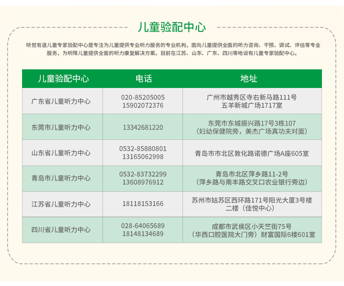 聽覺有道兒童專家驗配中心是專注為兒童提供專業聽力服務的專業機構,面向兒童提供全面的聽力咨詢、干預、調試、評估等專業服務,為聽障兒童提供全面的聽力康復解決方案。目前在江蘇、山東、廣東、四川等地設有兒童專家驗配中心。